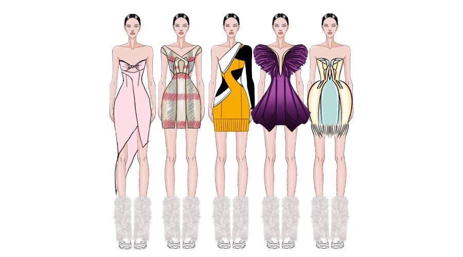 The original fashion designs displayed above were created digitally on an iPad Pro using Procreate, inspired by luxury perfumes. Each piece is meticulously crafted to embody the essence and mood of its fragrance. From left to right: